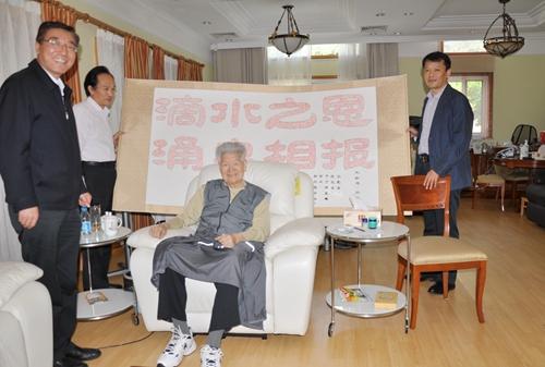 5月22日,孙其信校长带领党委校长办公室、教育发展基金会、推广处等部门负责人专程赴江苏吴江,拜会著名慈善家美籍华人唐仲英先生,代表学校向唐仲英先生的爱国热情及给予学校的关怀支持表示感谢!并向唐先生赠送了我校唐仲英爱心社学生制作的“滴水之恩、涌泉相报”书法作品。
