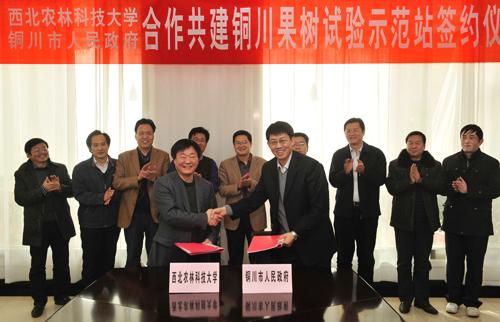 1月25日上午,我校与铜川市人民政府在国际交流中心举行了合作共建“铜川果树试验示范站”签约仪式。副校长李华、铜川市副市长曹远勃分别代表共建双方在协议书上签字。杨凌示范区管委会副主任刘天雄、铜川市政府办、果业局负责人和我校推广处、园艺学院负责人出席了签约仪式。