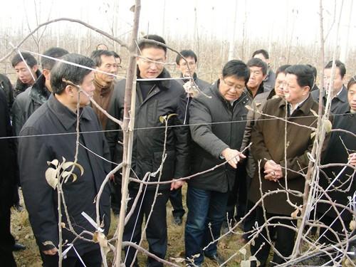 1月10日,省委常委、延安市委书记姚引良率延安市各县县长及主管果业的相关领导干部等一行34人,在省果业局局长高武斌、宝鸡市副市长景耀平、千阳县四大班子主要领导及相关部门负责人陪同下到西北农林科技大学千阳苹果试验示范站考察调研现代矮砧苹果产业。