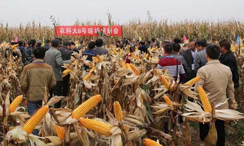 10月11日,来自全省地市县种子管理部门、种子经销商和玉米种植大户300多人在延安黄陵现场观摩我校专家选育的玉米新品种“农科大8号”田间长势。看着大田里一排排硕大的金黄色的玉米,大家连声称赞,对这一新品种产生了极大浓厚兴趣。